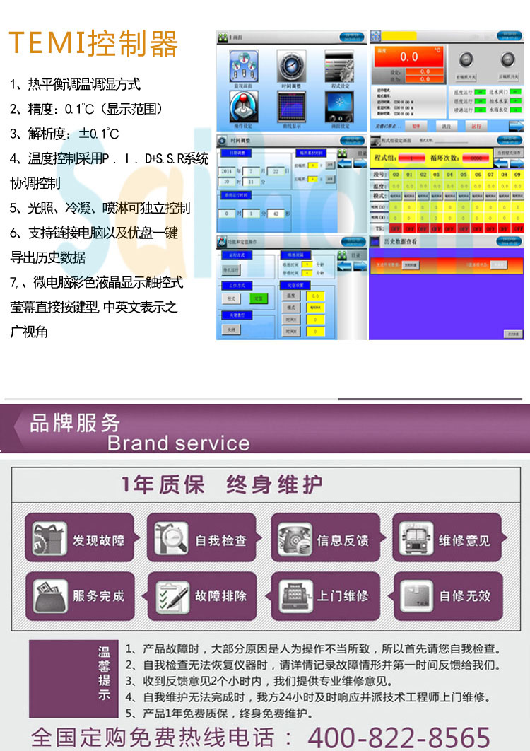 紫外線老化測試機保養(yǎng)及維護1.隨時保持外觀整潔。2.本機頂蓋上請勿放置物品以利馬達及控制零件之散熱。3.若測試物含塵量多時,請視情況清理內(nèi)部風車室風輪之出風量。4.請經(jīng)常檢查機臺之固定螺絲是否松動,請固定之。5.請貴公司維護保全人員,